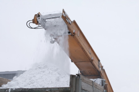 Winter. Municipal urban road maintenance. Snow removal on the streets. Close-up of falling snowballs from a snowplow and into a truck body. Abundance of snow.