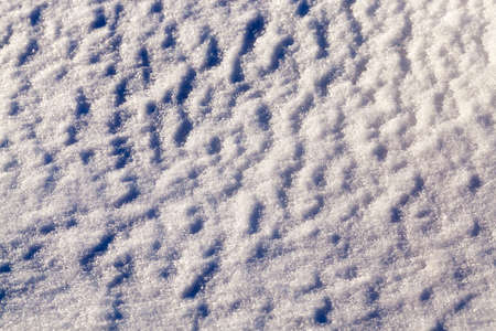 Snowy surface, the surface covered with a dense layer of snow in winter in the rays of the sun
