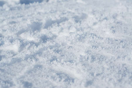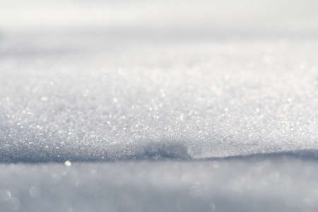 Sparkling white snow crystals covering ground wintertime close up. Texture of smooth surface covered soft snow at sunlight. Beautiful snowflakes shining on winter cold sunshine. Natural pattern.