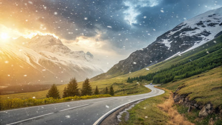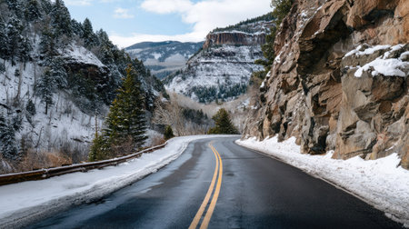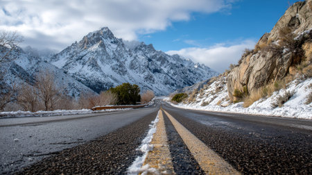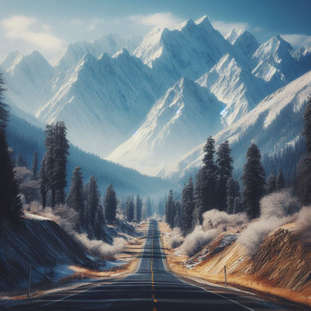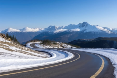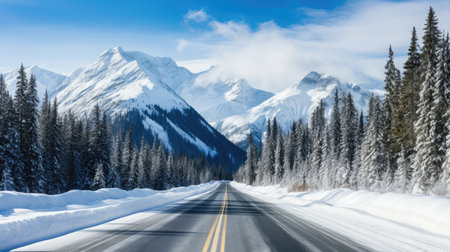 The highway stretches out in front a ribbon of grey surrounded by towering mountains dusted with snow and speckled with evergreens. . AI generation