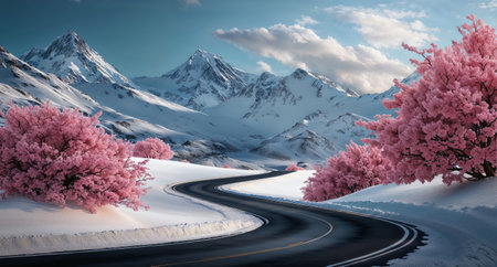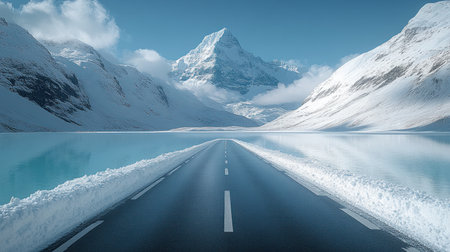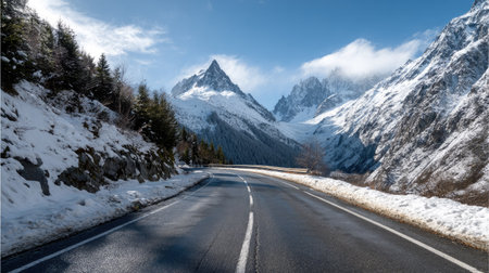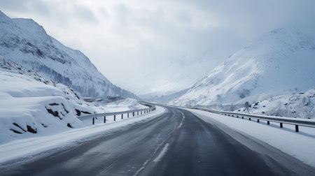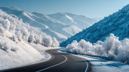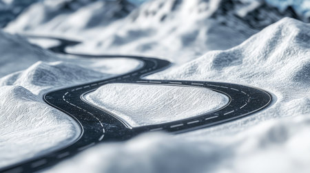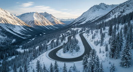 A winding road cuts through a winter wonderland, surrounded by snow-covered mountains. This serene landscape invites adventure and exploration in a tranquil setting.