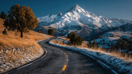 A captivating winter scene featuring a winding road surrounded by majestic snow-capped mountains and a clear blue sky, perfect for travel enthusiasts.