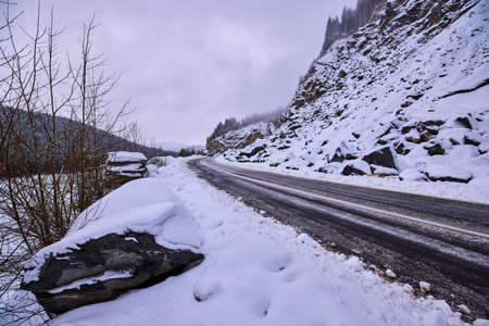 Mountain road with snow in winter. Caucasus Mountains, Georgia.