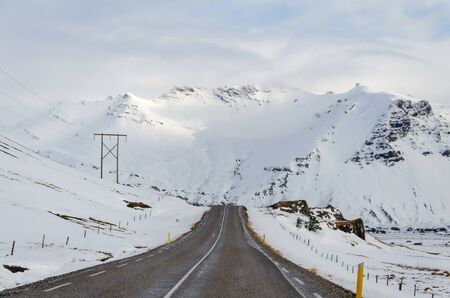 Typical Icelandic snowy nature mountain landscape and empty road near Arnarstapi area in Snaefellsnes peninsula in Iceland