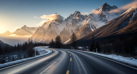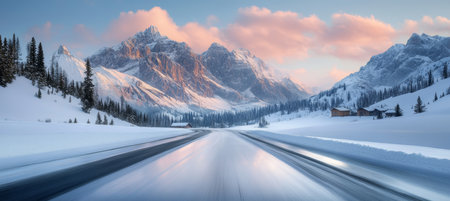A winding road traverses serene snowy mountains, illuminated by a pastel sunset. The crisp landscape invites tranquility and offers a breathtaking vista of nature's beauty.