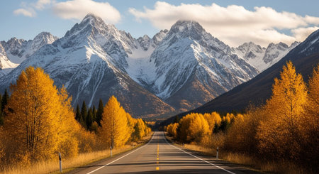 An asphalt road with yellow dividing lines cuts through a vibrant autumn forest, leading towards snow-capped mountain peaks. The trees lining the road are ablaze with golden yellow and orange foliage, contrasting with the dark green of evergreen trees and the stark white of the distant mountains. The sky is partly cloudy, with sunlight casting shadows and highlighting the dramatic landscape. captures the beauty of a scenic drive during the fall season.