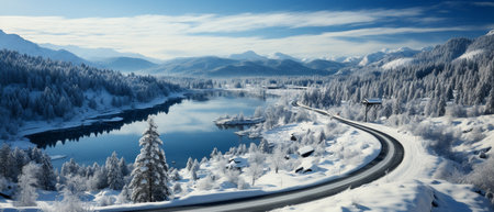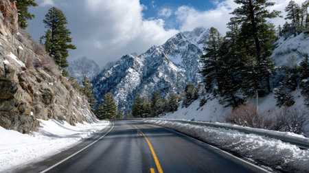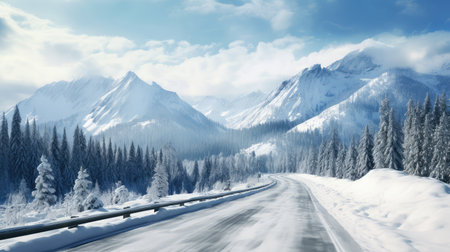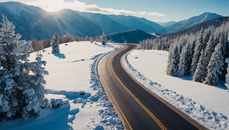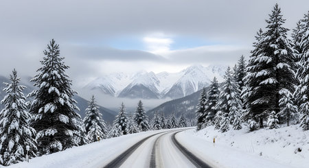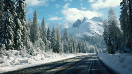 A beautiful winter road meanders through stunning snow-covered mountains and pine trees, offering a tranquil and picturesque scene for travelers and adventurers.