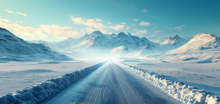 A stunning view of a road stretching through a winter wonderland, showcasing majestic mountains under a clear blue sky and a serene atmosphere.