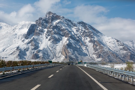 Beautiful photograph of a deserted road across snow covered, high rocky mountains