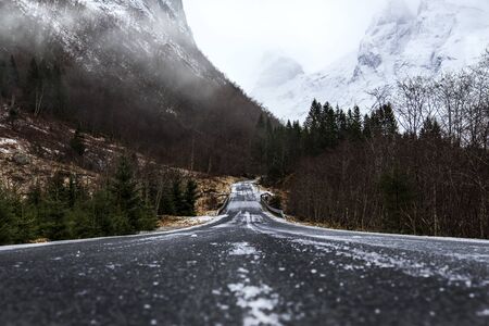 Road trip to Norway, driving on highway along beautiful high snowy mountains, traveling to Europe, freedom and adventure concept..