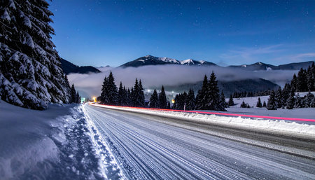 A snowy highway with car light trails streaking by like shooting stars adding a touch of excitement to the winter landscape