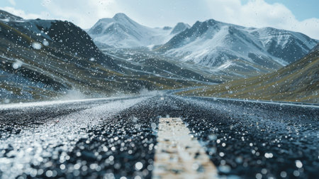 Rugged mountain road amidst a hailstorm, showcasing icy stones bouncing on the asphalt. the scene features a dramatic contrast between the stormy weather and the rugged mountain terrain in the background, ideal for weather-themed designs.