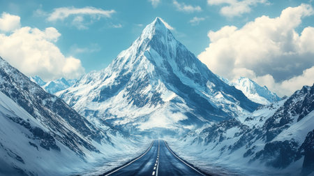 A majestic snow-capped mountain rises dramatically above a winding road, set against a bright blue sky dotted with fluffy clouds, creating a peaceful yet awe-inspiring view.