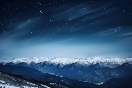 Winter mountains panorama with snow covered peaks and deep blue sky with stars