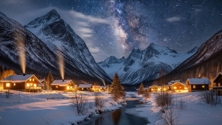 A picturesque village nestled amidst snow-covered mountains under a vibrant night sky. Warm lights glow from the houses, contrasting with the cool tones of the snow and dark sky. The composition emphasizes a serene atmosphere, with a stream flowing through the landscape. The image uses a digital painting style.