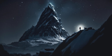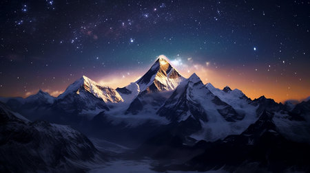 Snowy mountain peak with starry night sky, dramatic landscape view. Adventure and exploration concept