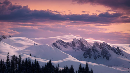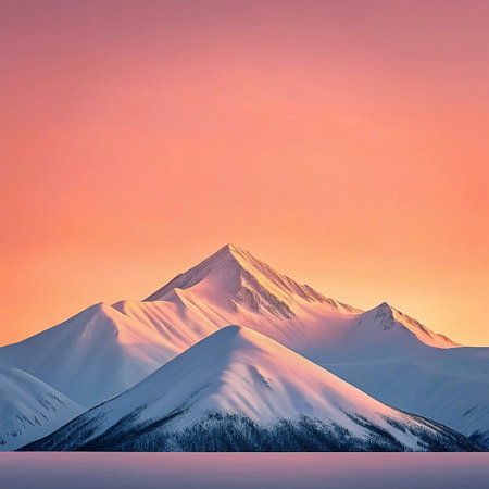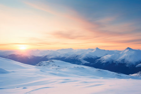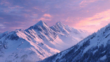 A professional winter landscape photo capturing a snow-covered mountain range at sunrise. The image features a harmonious blend of warm and cool tones, ideal for conveying tranquility and natural beauty. Perfect for use in travel, nature, and outdoor-themed projects.