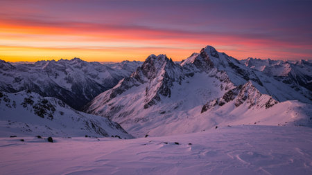 A breathtaking panorama of a vibrant sunset casting its warm hues over snow-covered mountain peaks.