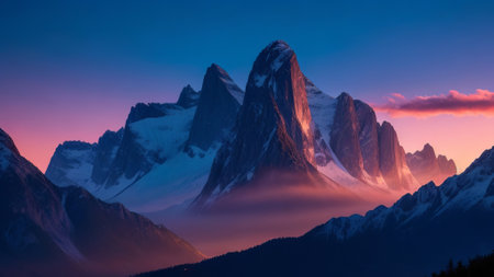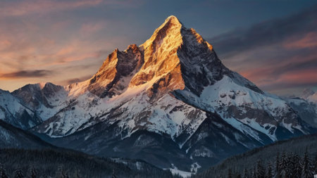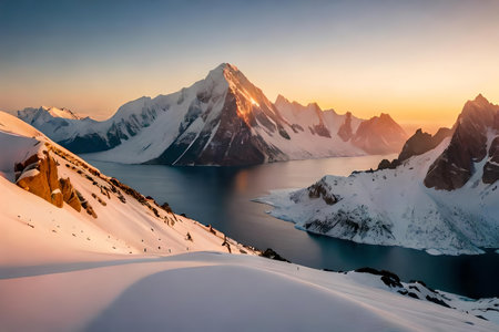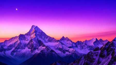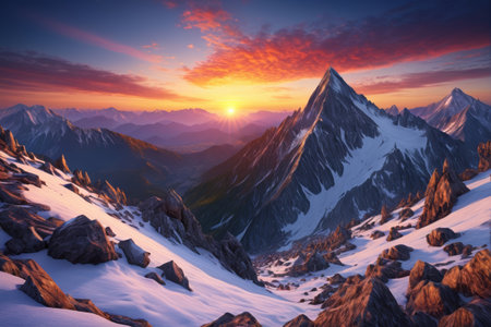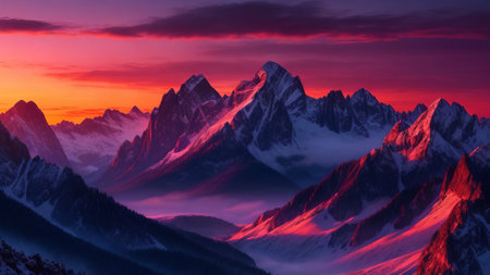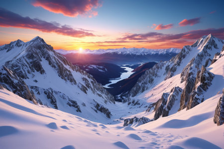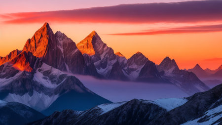 An AI generated illustration of a breathtaking view of a snow-capped mountain range at sunset