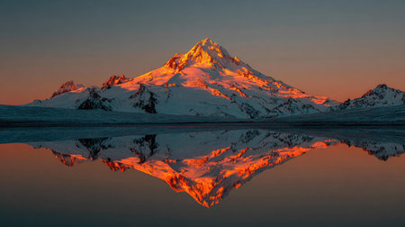 A majestic mountain peak, covered in snow, is mirrored in the calm water below. The scene is bathed in the warm light of the setting sun, creating a rich contrast of colors. The composition evokes a sense of peace and natural beauty, potentially suitable for travel or environmental themes.