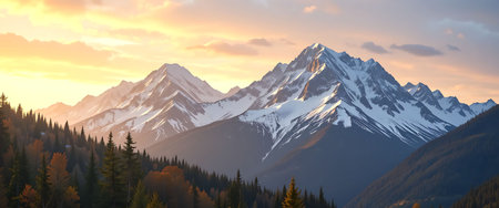 Majestic snow-covered mountains are lit by sunset with a colorful sky and soft clouds. Ideal for nature and travel-themed content.