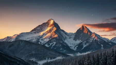 A high-quality winter landscape photo capturing a majestic snow-covered mountain range at sunset. The image features a harmonious blend of warm and cool tones, ideal for professional outdoor photography. Perfect for use in travel and nature-themed projects.