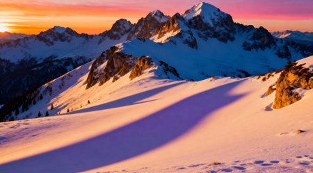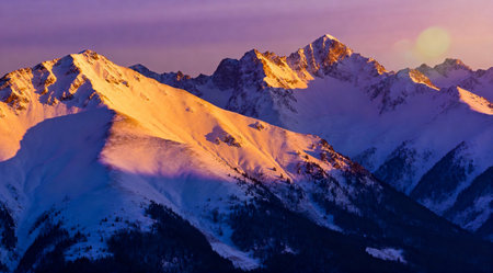 Snow covered peaks rise dramatically against a colorful sky as the sun rises, illuminating the tranquil winter scenery with warmth.
