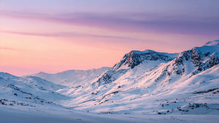 A wintry sunrise casting a soft pink light over snow-covered hills and mountains