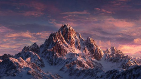 Purple sunrise light glowing on snowy mountains peaks