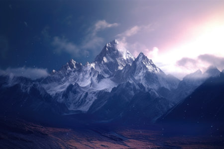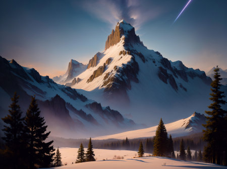 An AI generated illustration of a breathtaking view of a snow-capped mountain range at sunset
