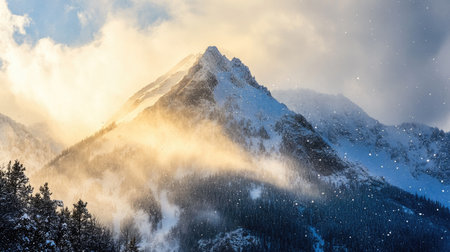 A stunning snow-covered mountain peak emerges from swirling mist and clouds during a captivating winter sunrise, creating a serene landscape.