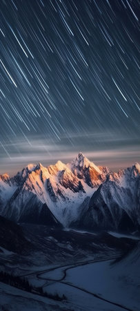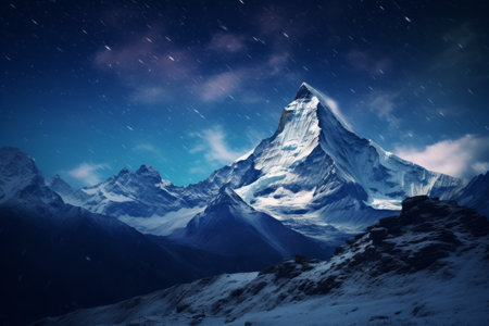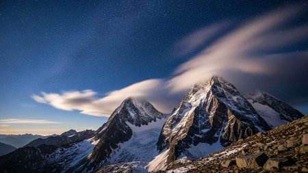 Majestic snow-covered mountain peaks under a starry night sky with wispy clouds, showcasing a serene and breathtaking landscape of rugged beauty and natural wonder.