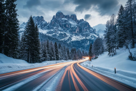 Winter road to the dolomites long exposure car trails amidst snowy peaks and trees