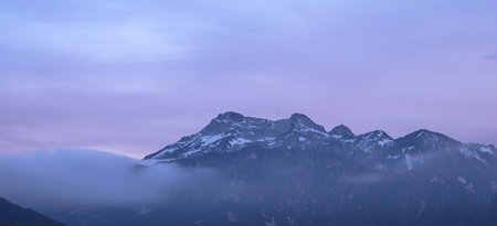 Panoramic view of the snowy mountains in the clouds. Switzerland