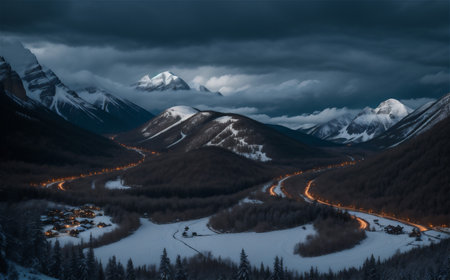 Captured at night, this image showcases highway trails winding through a mountain range. The trails of light from vehicles create streaks of orange and white. The composition features a dark sky, and the snowy mountain is present. Suitable for various commercial and editorial applications.