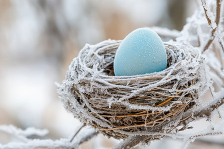 A delicate blue egg nestled in a frost-covered nest on branches, highlighting the serene beauty of winter and the promise of new life in nature's embrace