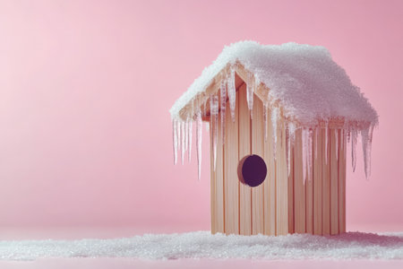 Birdhouse adorned with snow and icicles, positioned on a soft pink backdrop, evokes a whimsical winter ambiance, showcasing a charming and cozy design