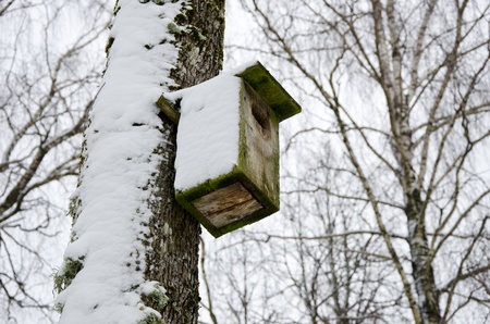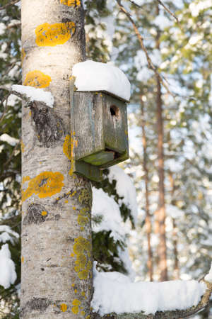 bird nesting box house covered with snow attached to birch tree trunk in winter