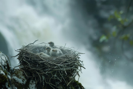 A nest of baby birds sits on a rock near a waterfall. Concept of tranquility and natural beauty, as the birds are surrounded by the peaceful sounds of the waterfall