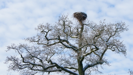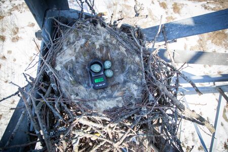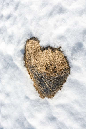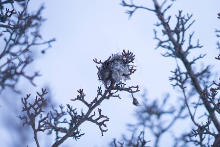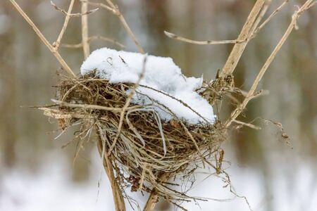 abandoned empty bird nest on branch in the winter with snow. Winter time
