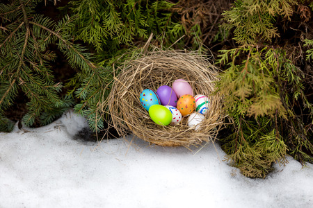 Closeup photo of painted Easter eggs hidden in nest at backyard