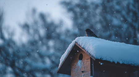 A charming bird sits atop a snow-draped birdhouse as gentle snowflakes fall, creating a serene winter atmosphere filled with tranquility.