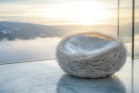 Stylish woven seating in a modern space overlooking misty mountains at sunrise