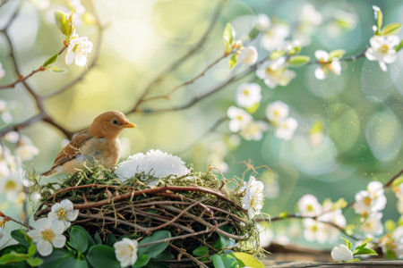 Birds nest with eggs nestled in a blooming tree under soft lighting and vivid colors