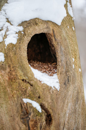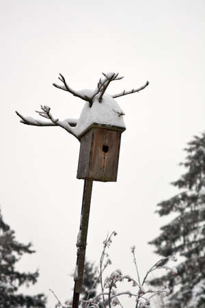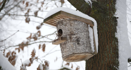 A rustic birdhouse provides shelter for birds during the cold winter months, nestled in a snowy landscape