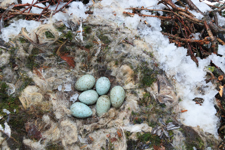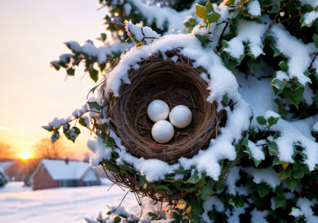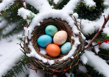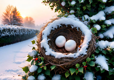 A cozy nest of speckled eggs rests in soft snow surrounded by fresh evergreen branches capturing the serene beauty of winter.