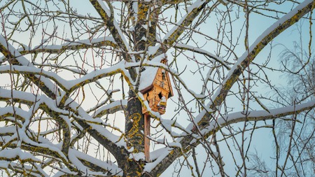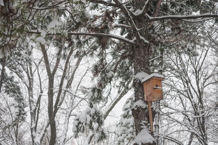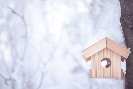 Modern Birdhouse on snowy park tree. Caring for wildlife concept