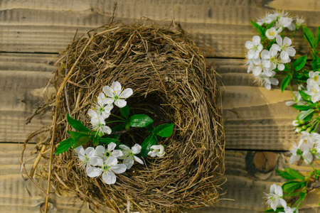 Nest with partridge eggs and willow twigs. Easter composition with a copy of the space