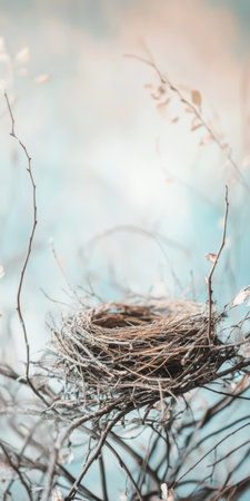 A bird nest composed of twigs and plant fibers is nestled within the branches of a tree. The image showcases a detailed texture and earthy tones with warm lighting. The composition suggests an outdoor environment during the day. This image is suitable for various editorial and commercial projects.