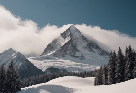 A picturesque snowy mountain is beautifully covered in fluffy clouds, set against the vivid backdrop of a clear blue sky